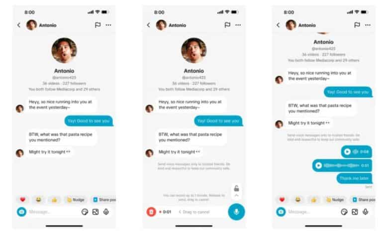 أعلنت منصة تيك توك إطلاق مزايا جديدة في خدمة الرسائل المباشرة (DMs)، تتيح للمستخدمين إرسال رسائل صوتية تصل مدتها إلى 60 ثانية، بالإضافة إلى إمكانية مشاركة ما يصل إلى تسع صور أو مقاطع فيديو في المحادثات الفردية والجماعية.